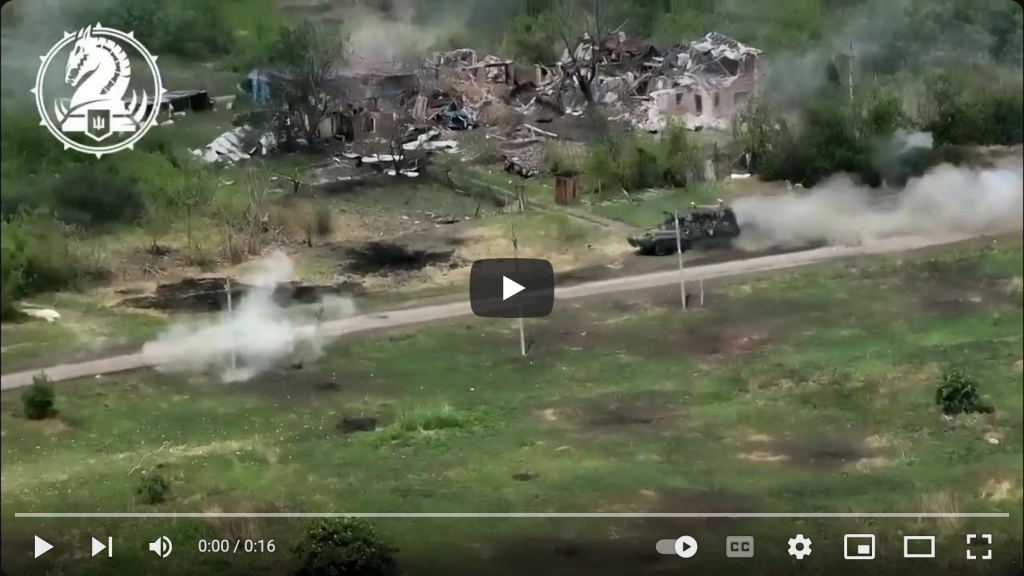 Video footage from a drone of a Ukrainian Bradley facing a Russian BTR at extreme close range. Date and location...