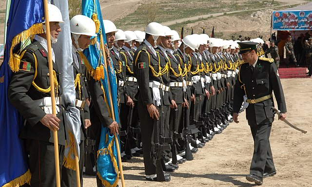 Qargha, Afghanistan (6 Apil, 2001) — Cadets from the National Military Academy Afghanistan stand in formation awaiting arrival of the official party for the cornerstone laying ceremony of the NMAA. This ceremony established NMAA and Defense University at Qargha. (U.S. Air Force photo by Staff Sgt. Jeff Nevison)